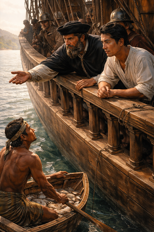 En un momento, Magallanes habló extensamente sobre su rey, sobre el orden, sobre la lealtad moldeada por el reconocimiento. Enrique tradujo, suavizando los bordes, acortando lo que sentía demasiado pesado.